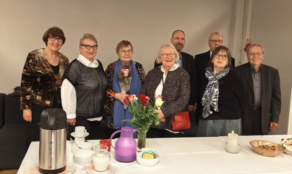 Vantaan yhdistyksen perustajajäsenet juhlivat 10-vuotiasta yhdistystä marraskuussa 2025 Leinikkitiellä.